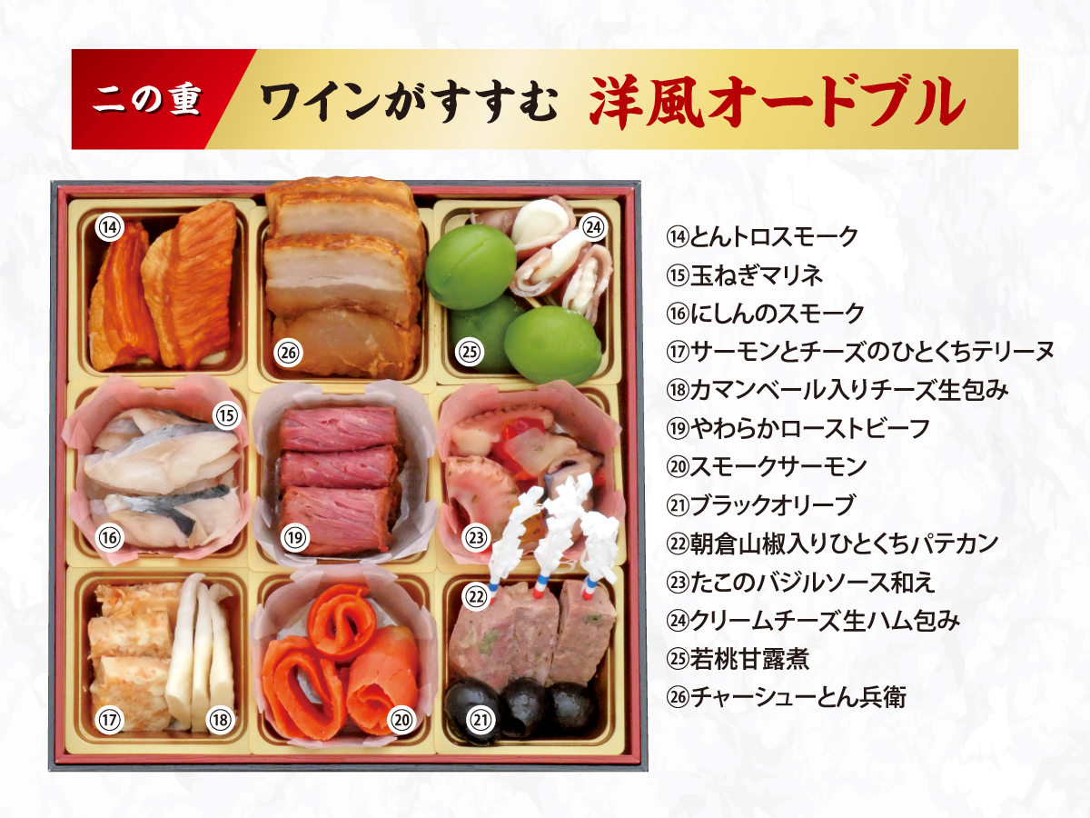 日本酒がすすむ和風おつまみと、ワインとじっくり味わえる洋風オードブル、合計26品のおつまみを楽しめます。