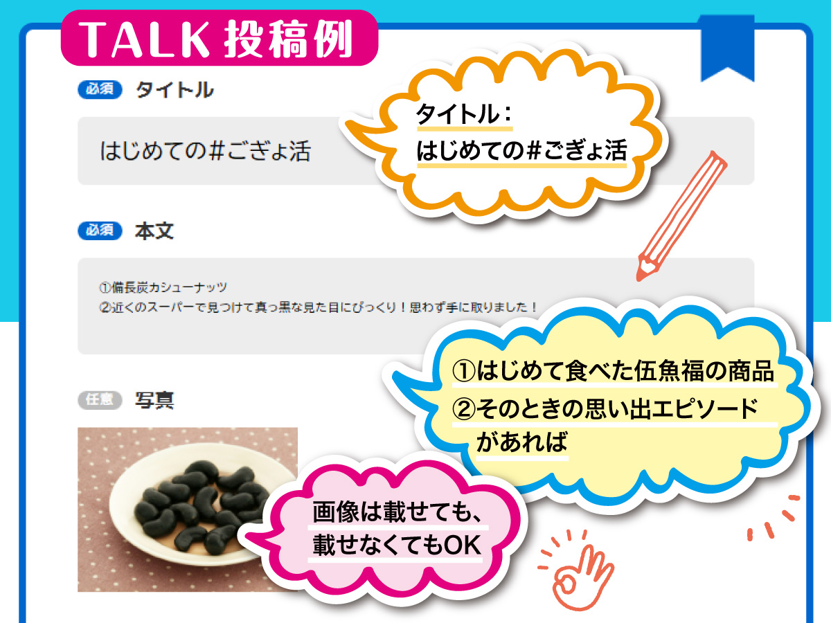 ごぎょふくパーク会員登録後、サイト内の「TALK」にて、
